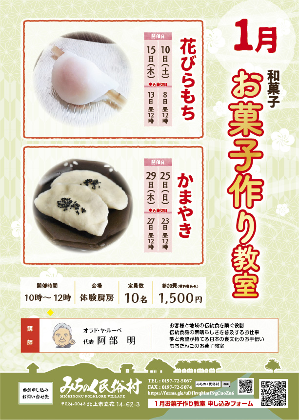 1月10日(土)、15日(木)、25日(日)、29日(木)、講師に「オラド・ヤ・ルーべ」の代表 阿部 明さんをお迎えし、和菓子 お菓子作り教室を開催いたします。