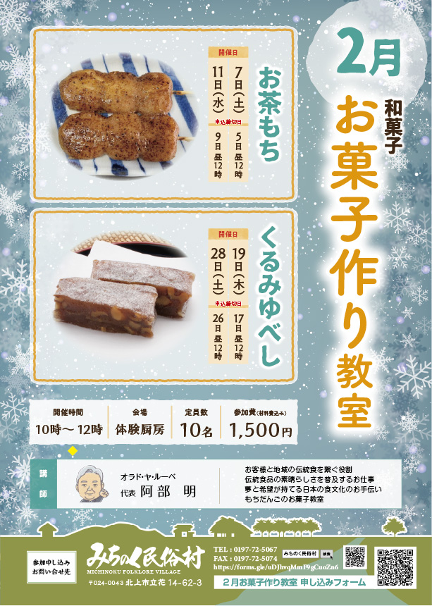 2月7日(土)、11日(水)は「お茶もち」、19日(木)、28日(土)は「くるみゆべし」を作ります。