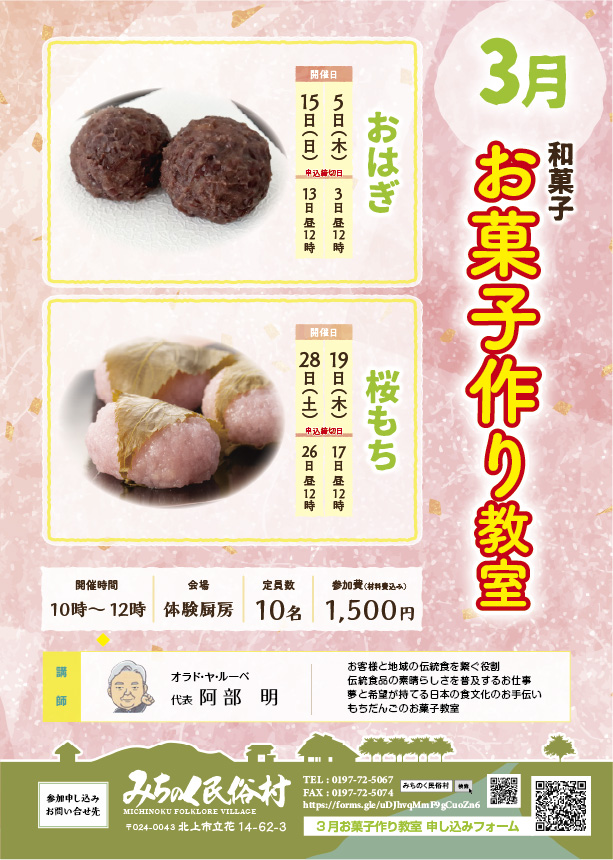 3月5日(木)、15日(日)、19日(木)、28日(土)、講師に「オラド・ヤ・ルーべ」の代表 阿部 明さんをお迎えし、和菓子 お菓子作り教室を開催いたします。
